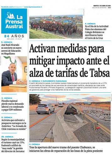 Apartir de este jueves 9 de abril, la empresa Tabsa implementará un incremento transitorio del 21% en promedio en las tarifas de sus servicios de conectividad marítima, afectando las rutas entre Punta Arenas-Porvenir-Punta Arenas y Primera Angostura. La medida responde a un contexto internacional crítico que ha disparado el precio del diésel en cerca de un 90%, situación que la compañía calificó como insostenible tras haber absorbido los costos durante más de un mes.