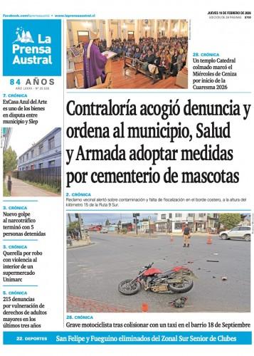 El lunes 16 de febrero la Contraloría General de la República, sede regional Magallanes y de la Antártica Chilena, decretó que las entidades involucradas en la instalación del denominado cementerio de mascotas a orillas del Estrecho, disponen de un plazo de 30 días hábiles, contados desde la recepción del oficio emitido ese mismo día, para informar sobre las medidas adoptadas y buscar una solución al problema sanitario que genera esta ocupación irregular de terreno.